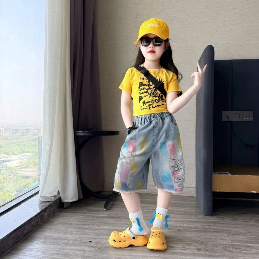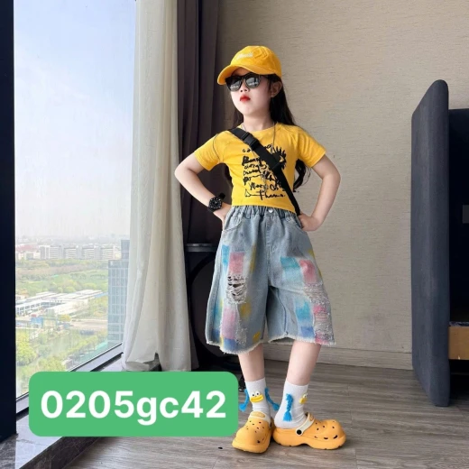 0205gc42 ÁO CROPTOP VÀNG MIX JEANS SẮC MÀU ✔Size : 120-170 🌸 giá áo giá 145k quần giá 200k 🐬 chốt 2/5