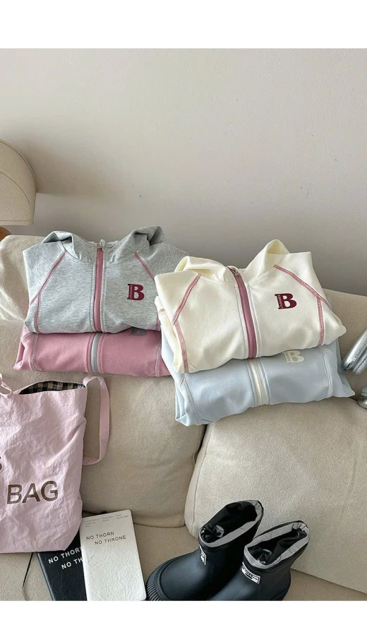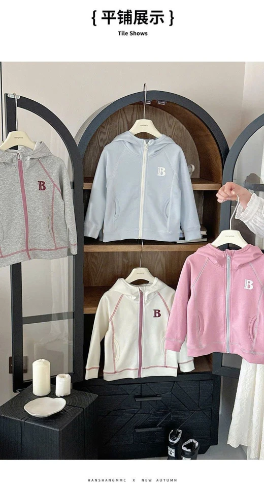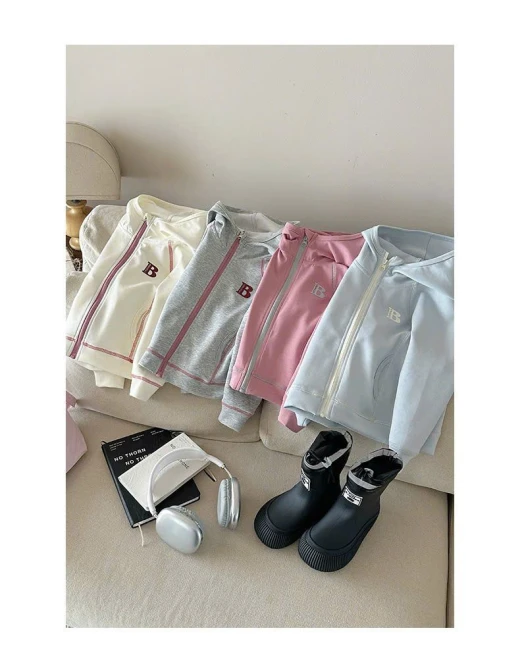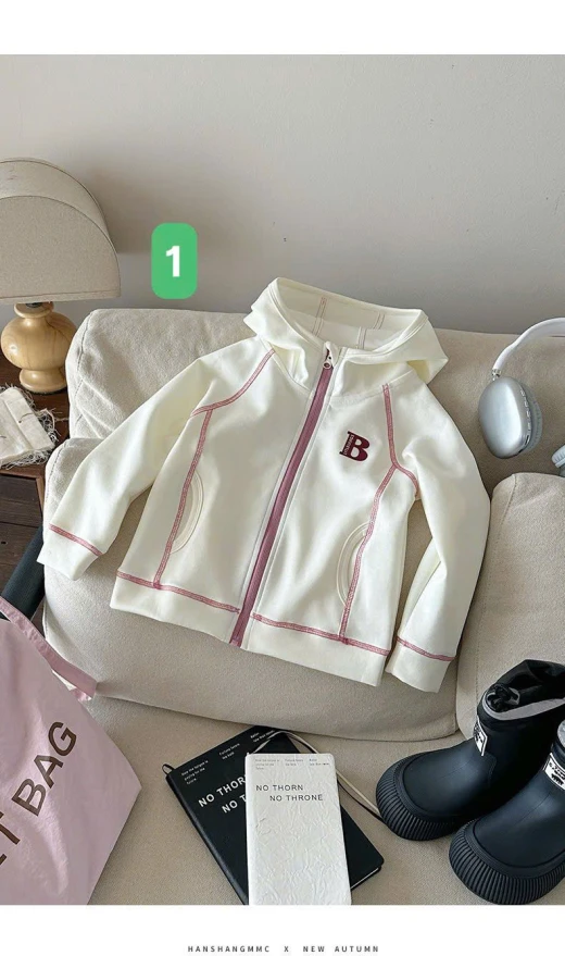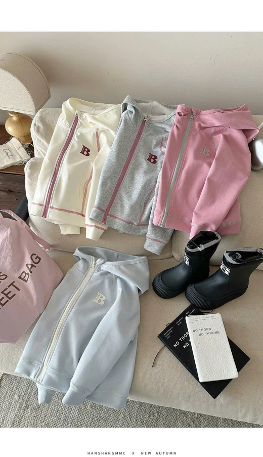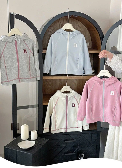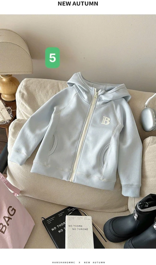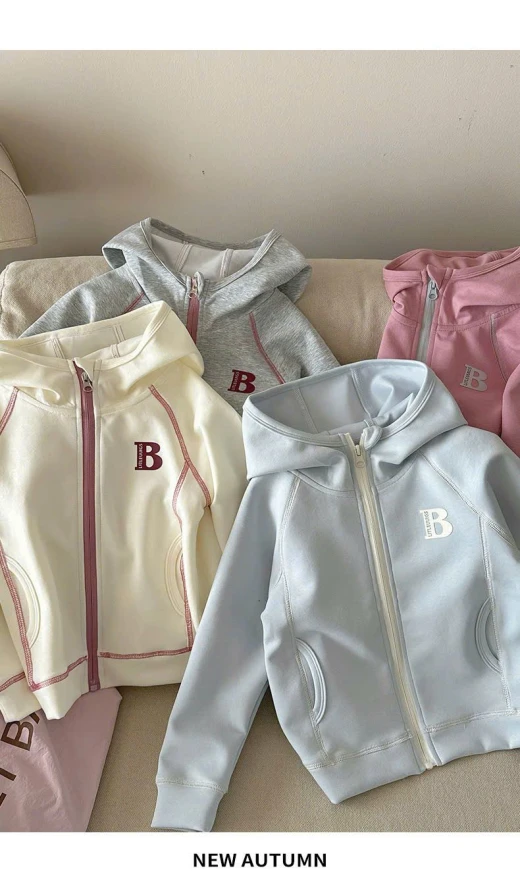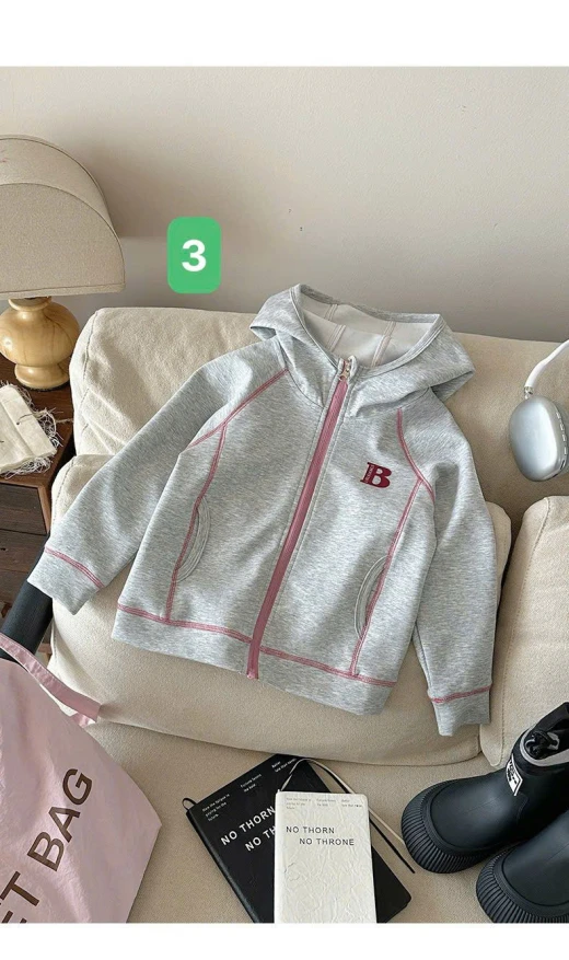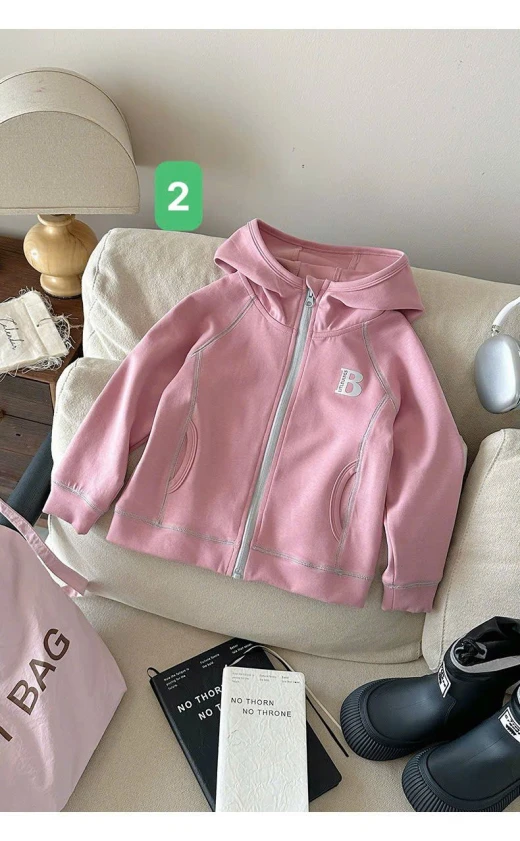 0710hc67 ÁO KHOÁC CHỮ B CÓ MŨ BG Sắm dần thui các mẹ ơi, cute dễ thương quá nè 4 màu đánh số sz 90-150 🌸 giá 181k 🐬 chốt 7/10