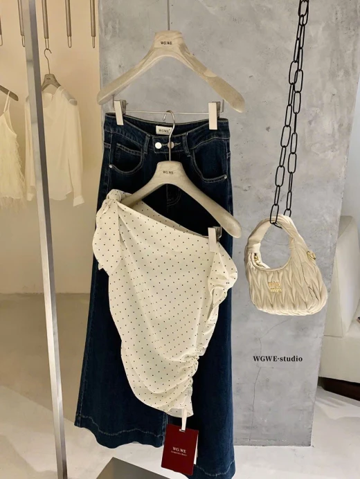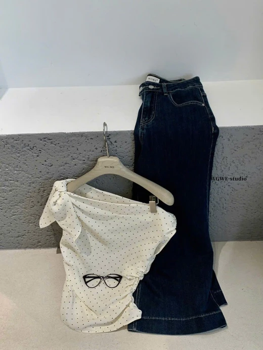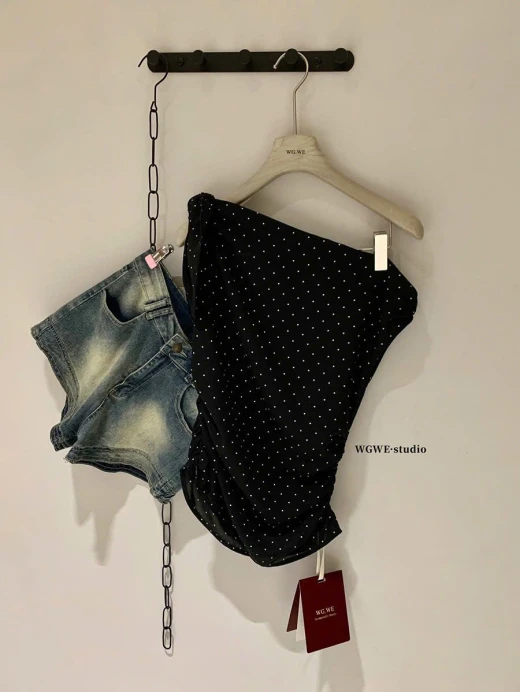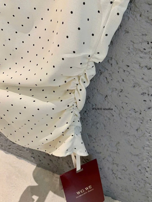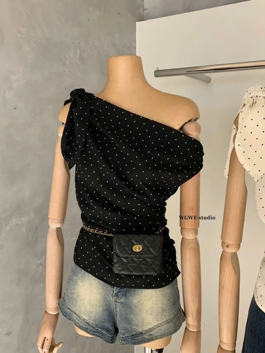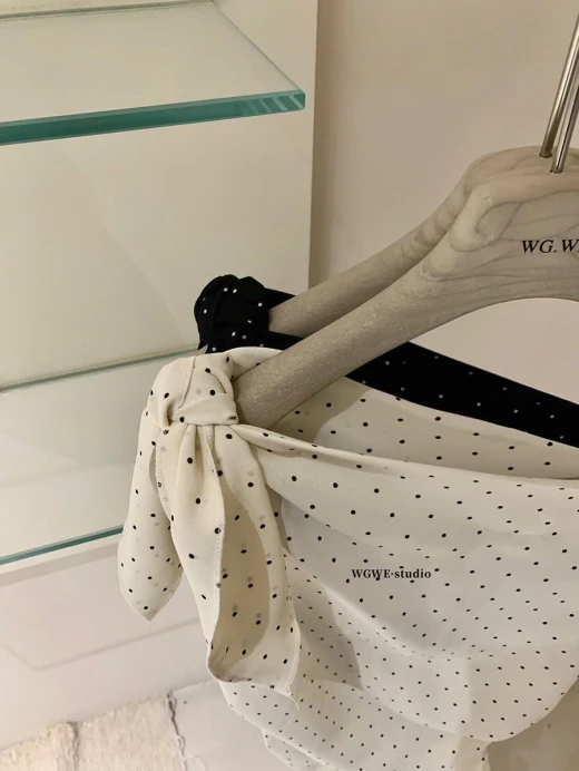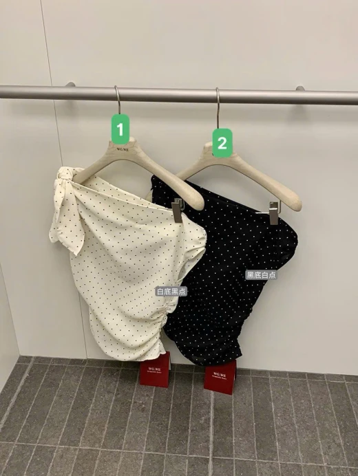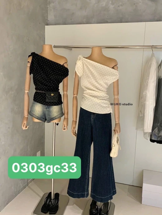 0303gc33 ÁO LỆCH VAI CHẤM BI WGWE Em này phối quần jeans, cv dài ngắn gì cũng xinh nhắm 2 màu : đánh số sz SM 🌸 giá 173k 🐬 chốt 3/3