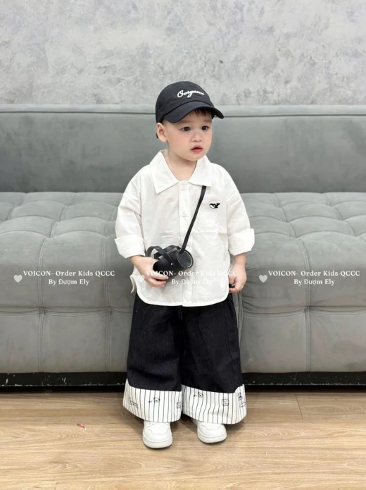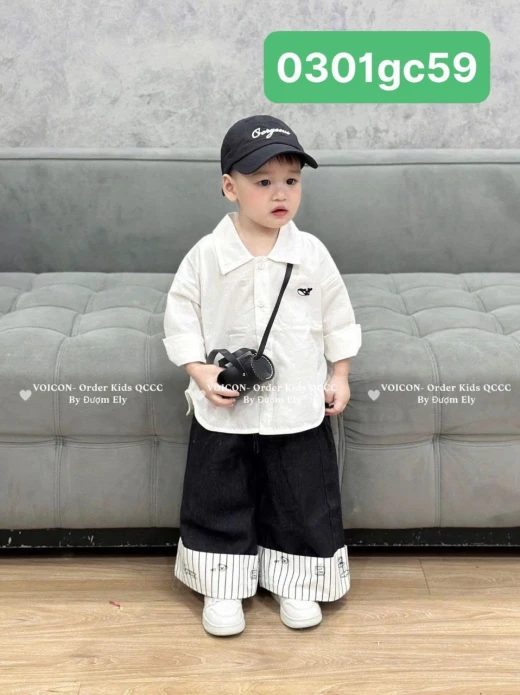 0301gc59 ÁO SƠ MI MIX QUẦN JEAN ỐNG RỘNG Style này bé gái bé trai mặc đều okela ạ áo sơ mi 3 màu: TRắng - xanh - Be Quần jean duy nhất 1 màu như hình Sz: 90 100 110 120 130 140 Giá: áo 129k , quần 163k Chốt 0301