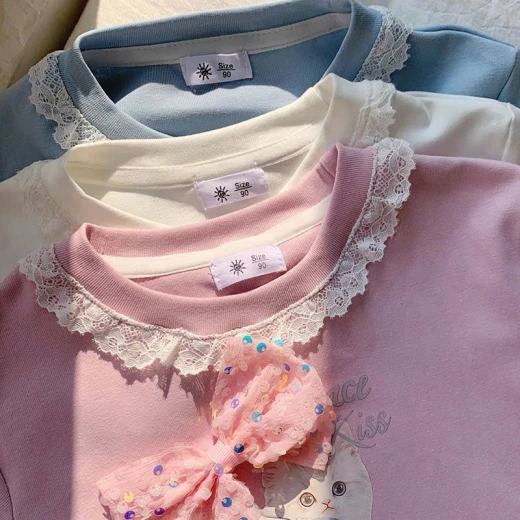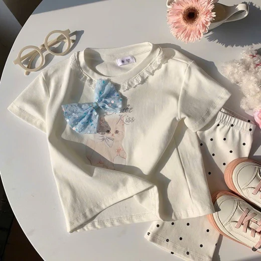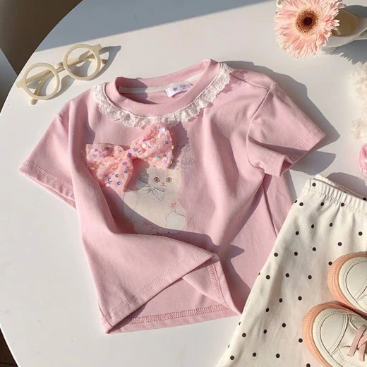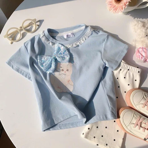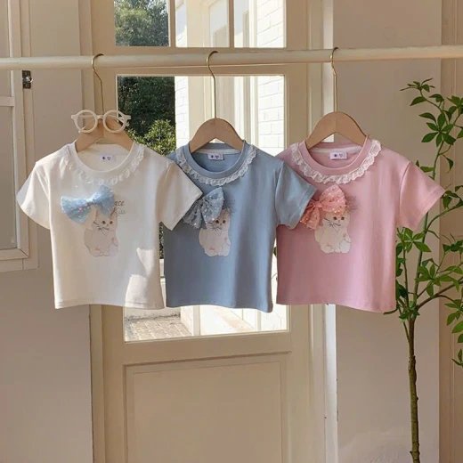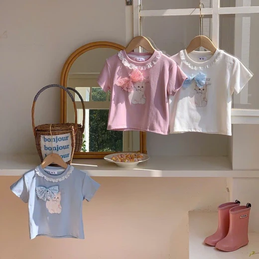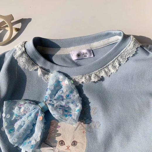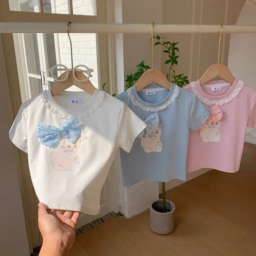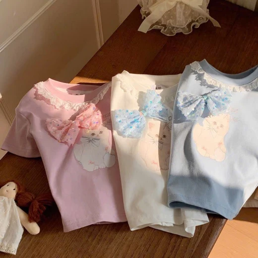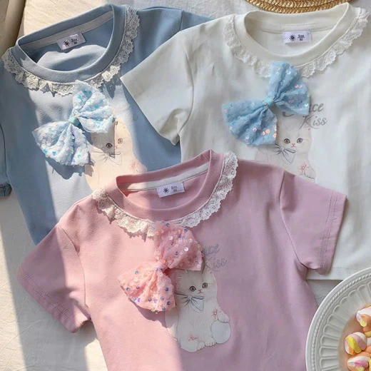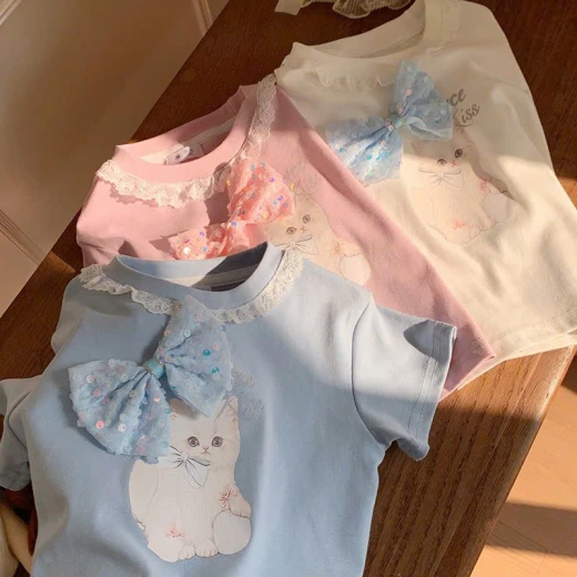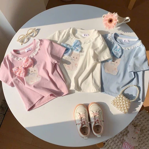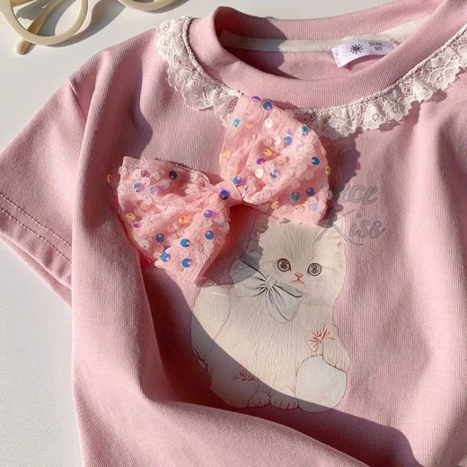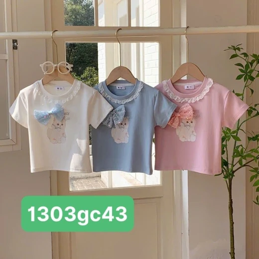 1303gc43 ÁO THUN MÈO GẮN NƠ ✔3 màu : xanh , hồng , trắng ✔Size : 90-150 🌸 giá 89k 🐬 chốt 13/3
