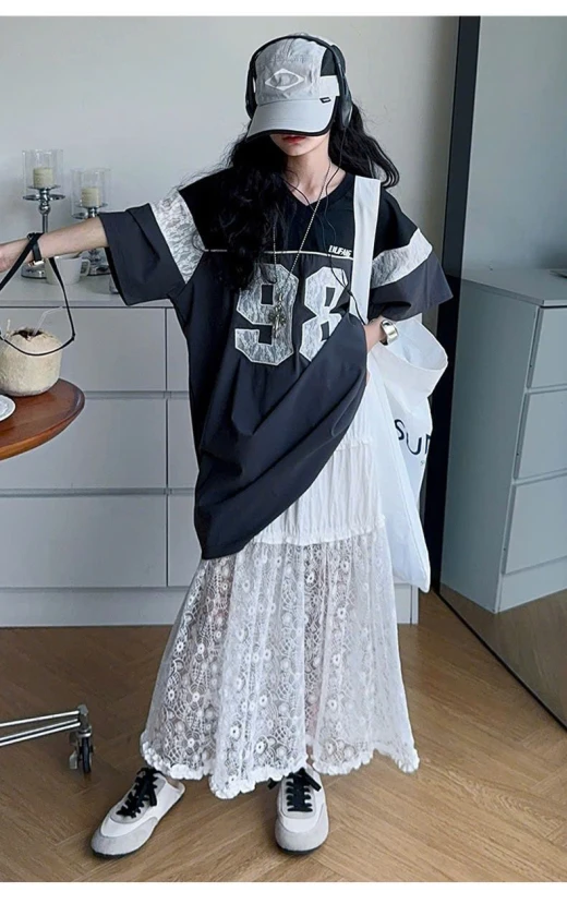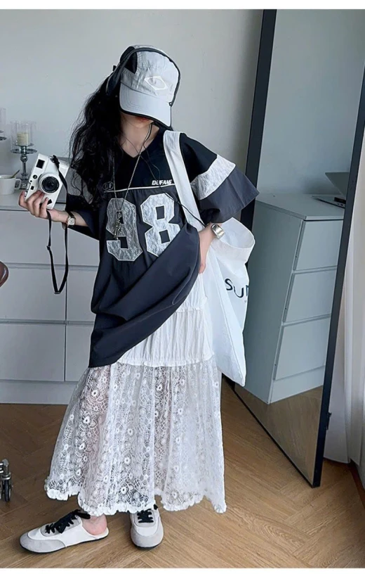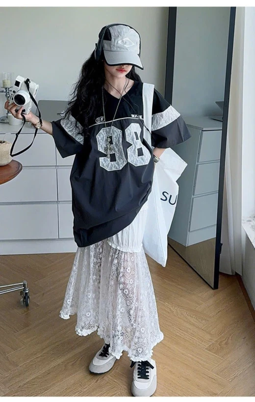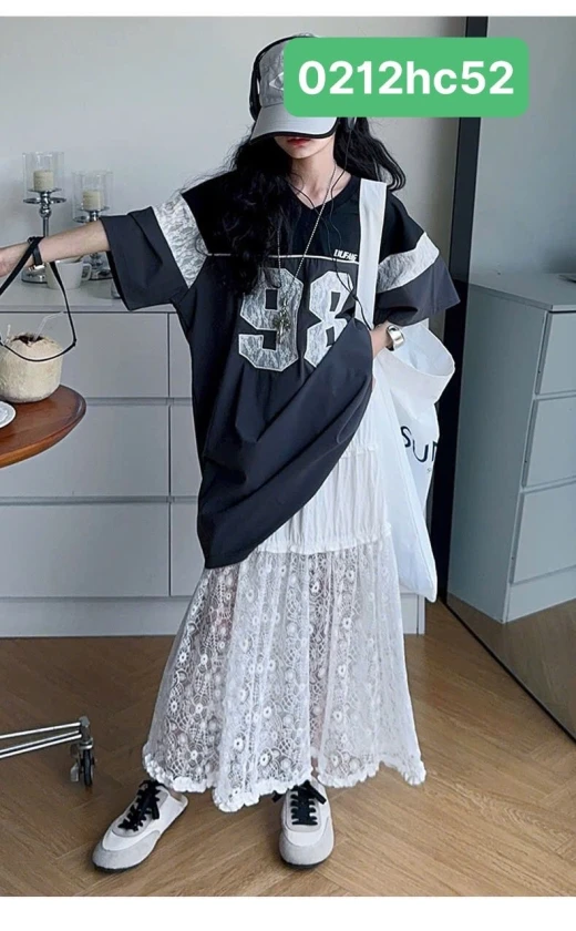 0212hc52 ÁO THUN THỂ THAO SỐ 98 MIX CHÂN VÁY REN DÀI Chính là outfit đỉnh chóp này đây – thể thao nhưng vẫn ngọt ngào, đáng yêu lắm luôn Size 120-170 🌸 giá áo: 160k cv: 174k 🐬 chốt 0212
