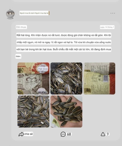 0201gc69 E thề mọi người mà chưa ăn thử thì nên mua thừ ngay nha, khác hẳn các loại bán ở VN luôn . E là đứa mê hướng dương nên loại này nên mua suốt, khách đến ai cũng khen ấy. E gom thêm hướng dương đen Hứa Vĩ Hoành nữa nha 😍 Ngon lắm mn a, hàng hãng chọn lọc cực kì chất lượng 🌼 Hạt hướng dương xứng đáng 💯 điểm từ nhà Huaweiheng (Hứa Vĩ Hoành) . ‼️ ‼️ HẠT HƯỚNG DƯƠNG #Huaweiheng 🌸🌸 ➖ Có 2 vị : - Truyền thống nguyên vị - gói nâu ( hương hồ đào thơm thơm ) - Vị Caramen -gói trắng (ngọt nhẹ) Em nhận đơn theo set 2 gói #1xxk____1xxk/combo 2 gói (trọng lượng : 500gr /1 gói) ➖Chia Set cho các chị dễ lựa ✅Set 1 : 2 gói vị caramen ✅Set 2 : 2 gói vị hồ đào ✅Set 3 : 2 gói mix 2 vị thưởng thức E lựa hàng chuẩn hãng Huaweiheng mọi năm em đều làm , bảo đảm chất lượng, ko phải hàng rẻ tràn lan trên tt đâu ạ Bao bì sản phẩm có thể thay đổi tuỳ từng đợt sản xuất nha ce. Còn chất lượng thì vẫn ko thể chê đc ạ 😆 Date 8 tháng thoải mái ạ ======== gom thêm giá 109k / 1 set 2 gói chốt 0201