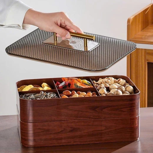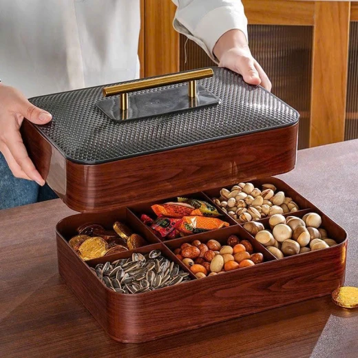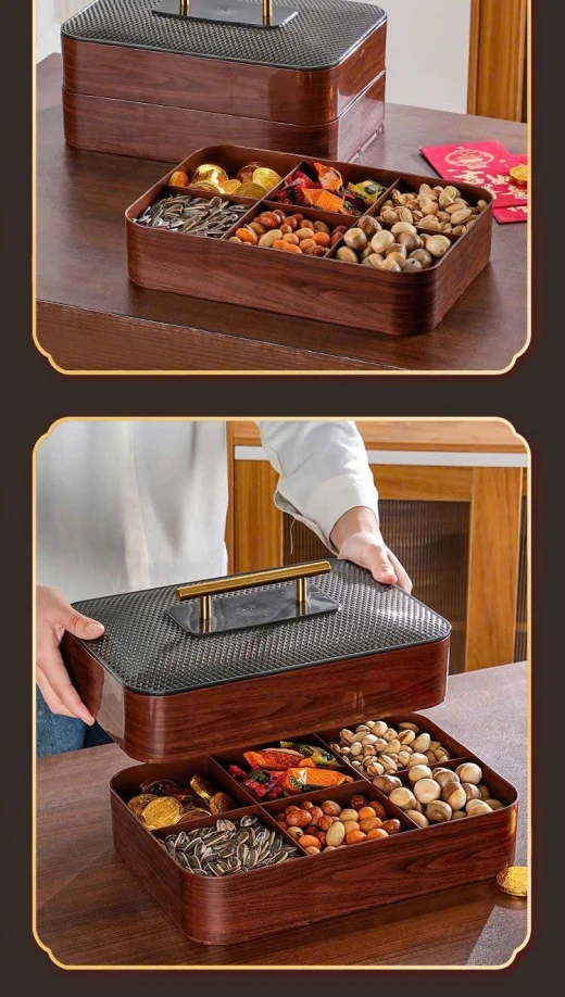 3012hc58 KHAY ĐỰNG GIẢ VÂN GỖ Nắp kín giúp bảo quản mứt tránh bụi bẩn, côn trùng và giữ được độ giòn, ngon lâu hơn - Với 6 ngăn to giúp sắp xếp nhiều loại mứt khác nhau (mứt dừa, mứt gừng, kẹo, Bày hoa quả sấy, hạt khô ,hạt dưa, hạt bí, hạt điều ,ô mai...) trong cùng một khay. - Vân gỗ thẩm mỹ, trang trọng lịch sự cho bàn trà ngày Tết hoặc Đựng bánh kẹo thường ngày Trang trí bàn trà, bàn tiếp khác 3 mẫu đánh số ✅kt dưới ảnh 🌸 giá 1 tầng (1): 125k 2 tầng (2): 165k 3 tầng (3): 205k 🐬 chốt