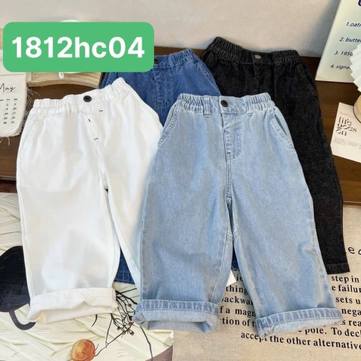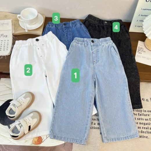 1812hc04 QUẦN JEAN LƯNG CHUN CHO BÉ Lưng chun co giãn tốt – bé mặc vào là thấy dễ chịu Phù hợp cho cả bé trai lẫn bé gái ạ 4 mẫu đánh số ✅sz 80-130 80: 9-11kg 90: 11-13kg 100: 13-15kg 110: 15-17kg 120: 17-20kg 130: 20-25kg 🌸 giá 159k 🐬 chốt 18/12