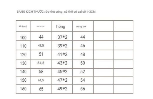 2103gc42 🌷 🌷 QUẦN JEAN ỐNG LỬNG HÀN QUỐC 🌷 🌷 Hottrend năm nay đích thị là em ống lửng này, Bảng sz dài miên man mẹ nào minhon thoải mái bon chen ạ Sz: 100-160 Bảng sz tham khảo 100: ~25 –30斤 (12–15kg) 110: ~30–38斤 (15–19kg) 120: ~39–45斤 (19–22.5kg) 130: ~45–53斤 (22.5–26.5kg) 140: ~54–68斤 (27–34kg) 150: ~69–85斤 (34.5–42.5kg) 160: ~85–100斤 (42.5–50kg) Giá: 176k Chốt 2103