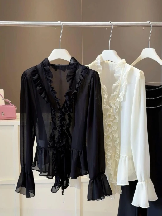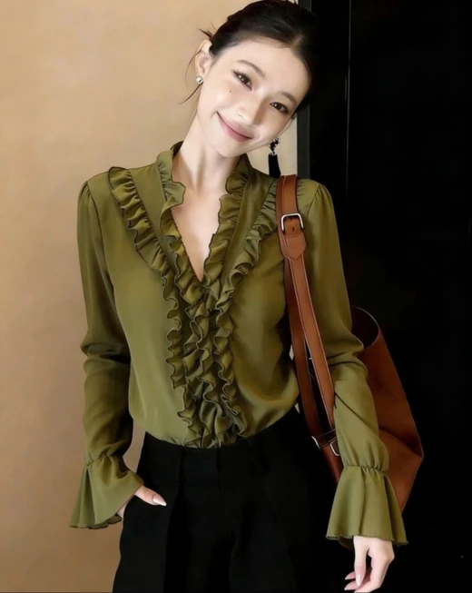2803gc35 ✅ ✅ SƠ MI VOAN ANNA MẪU MỚI Áo kiểu Pháp dài tay cổ V ngọt ngào,, mix váy quần xinh sang ✔4 màu: Trắng - Đen - Rêu - Tím Freesize <65kg (hàng thực tế có thể đậm hoặc nhạt hơn so với mẫu) 🚫 Hàng OD trả sau 2-5 tuần, có thể nhanh hoặc chậm hơn tuỳ shop phát hàng Giá: 182k Chốt 2803